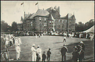 Though the Club stopped playing tennis in 1920, the lawn bowlers remained resilient and continued to use the grounds. The members had access to lockers in the basement of the Court House. In 1952 the County advised the Club that they would have to move as the grounds would be needed to construct a Land Registry Office. The image shown here dates back to the first decade of the 20th century; the occasion marked a visit by a contingent of British lawn bowlers. The Court House is visible in the background.